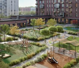 В закрытых дворах-парках предусмотрены игровые площадки, лужайки для пикников и йоги. Пространства для спокойного отдыха будут огорожены живыми изгородями.