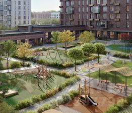 В закрытых дворах-парках предусмотрены игровые площадки, лужайки для пикников и йоги. Пространства для спокойного отдыха будут огорожены живыми изгородями.