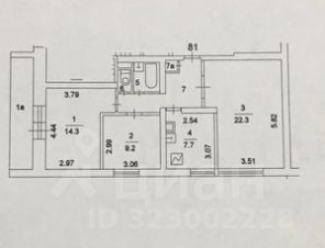 Кухня 7,7 кв.м., 3 изолированные комнаты 22,3 кв.м., 14,3 кв.м., 9,2 кв.м., совмещенный санузел с душевой кабиной, большая лоджия 6,6 кв.м.