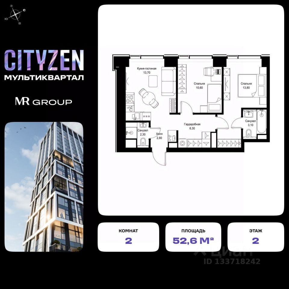 Продается 2-комнатная квартира от застройщика в жилом мультиквартале CITYZEN на 2-м этаже в корпусе #6 урбан-блока VOLNA. Общая площадь лота составляет 52.60 м²