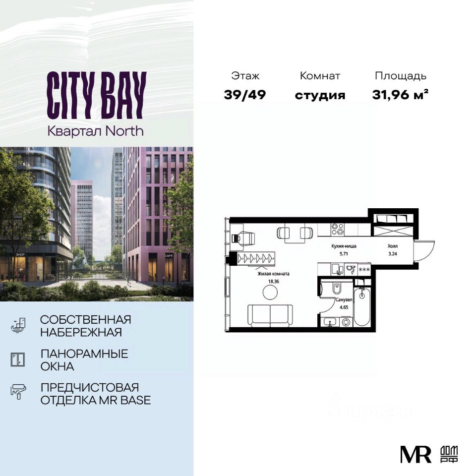 Продаётся студия общей площадью 31.96 м² с предчистовой отделкой в ЖК City Вау, квартале North, на 39-м этаже 49 этажного дома.