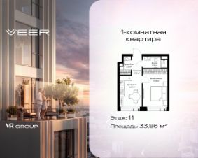 Продаётся 1-комнатная квартира общей площадью 33.86 м² без отделки в ЖК VEER на 11-м этаже 25 этажного дома.
