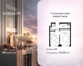 Продаётся 1-комнатная квартира общей площадью 33.86 м² без отделки в ЖК VEER на 23-м этаже 25 этажного дома.