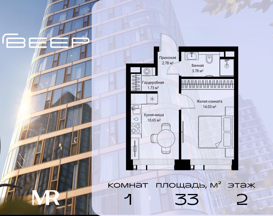 Продаётся 1-комнатная квартира общей площадью 32.97 м² без отделки в ЖК Веер на 2-м этаже 70 этажного дома.