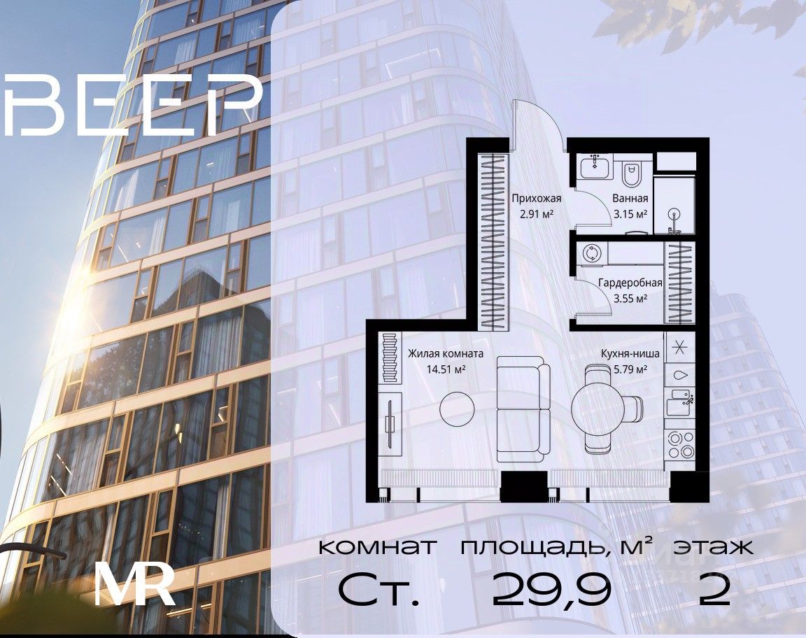 Продаётся студия общей площадью 29.91 м² без отделки в ЖК Веер на 2-м этаже 70 этажного дома.