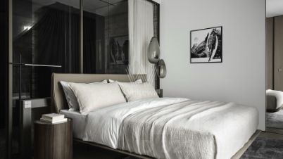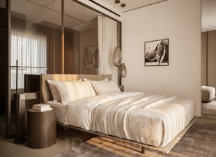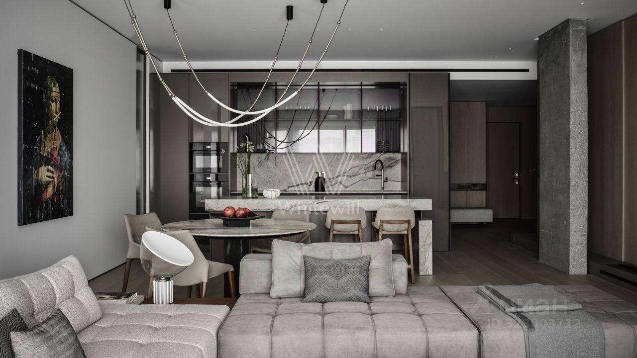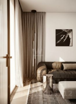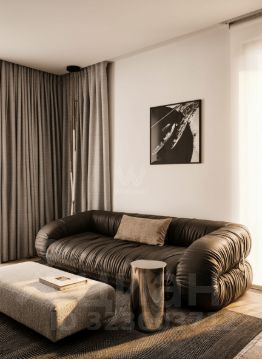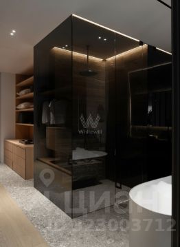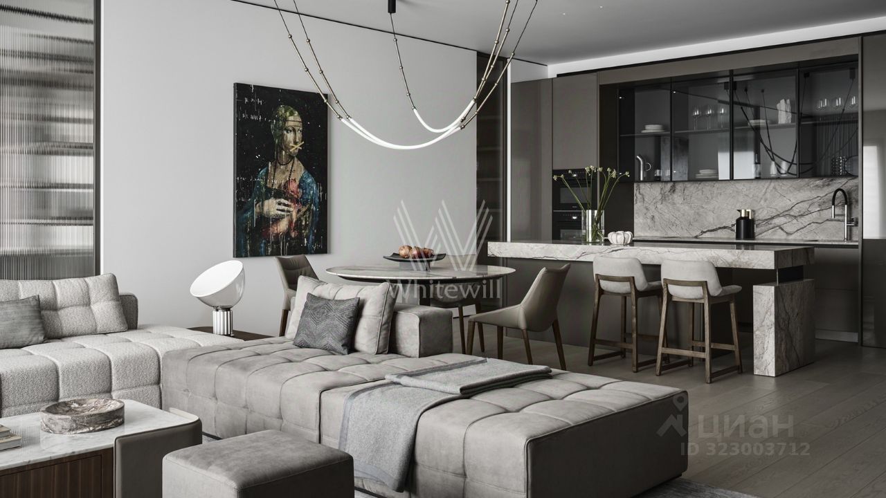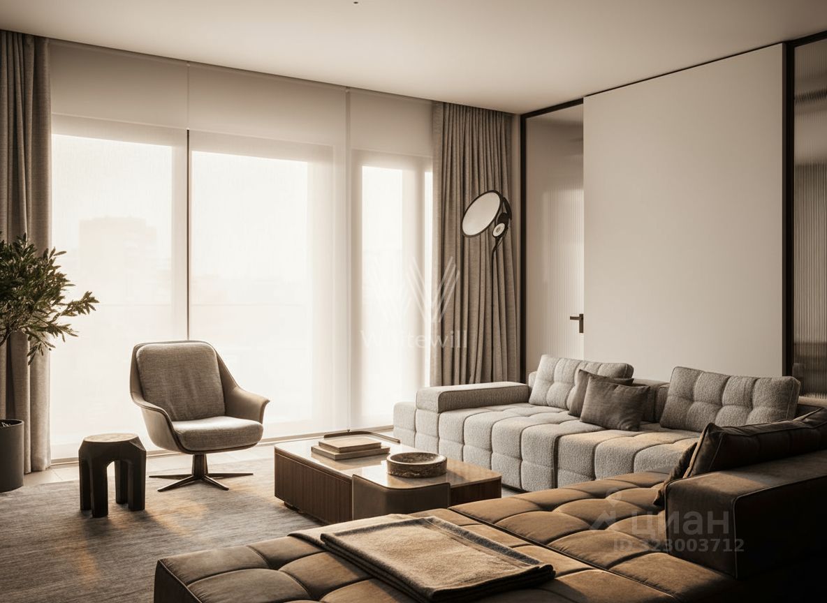 Квартира укомплектована мебелью и бытовой техникой. Функциональная планировка включает кухню-гостиную с обеденной зоной и выходом на балкон, мастер-спальню с собственной ванной комнатой и гардеробной, две спальни со своими санузлами, гардеробную и холл. Из окон открываются виды на улицу и территорию комплекса.