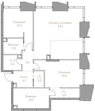 Представляем квартиру с 2 спальнями площадью 90,9 м2 на 2 этаже.