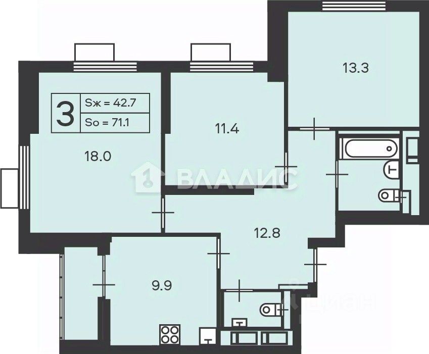 - Планировка: три изолированные комнаты , два санузла (один раздельный, один совмещённый), лоджия.