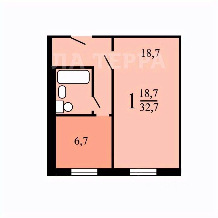 Общая площадь квартиры 32,7 м2: изолированная комната правильной формы - 18,7 м2, кухня 6,7 м2, совмещенный санузел с полноценной ванной.