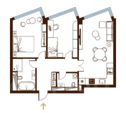 Возможен вариант планировки, в котором правильно разделены общее и личное пространства: хозяйская спальня и детская или кабинет, просторная кухня-гостиная для теплых встреч и общения, а также два санузла.