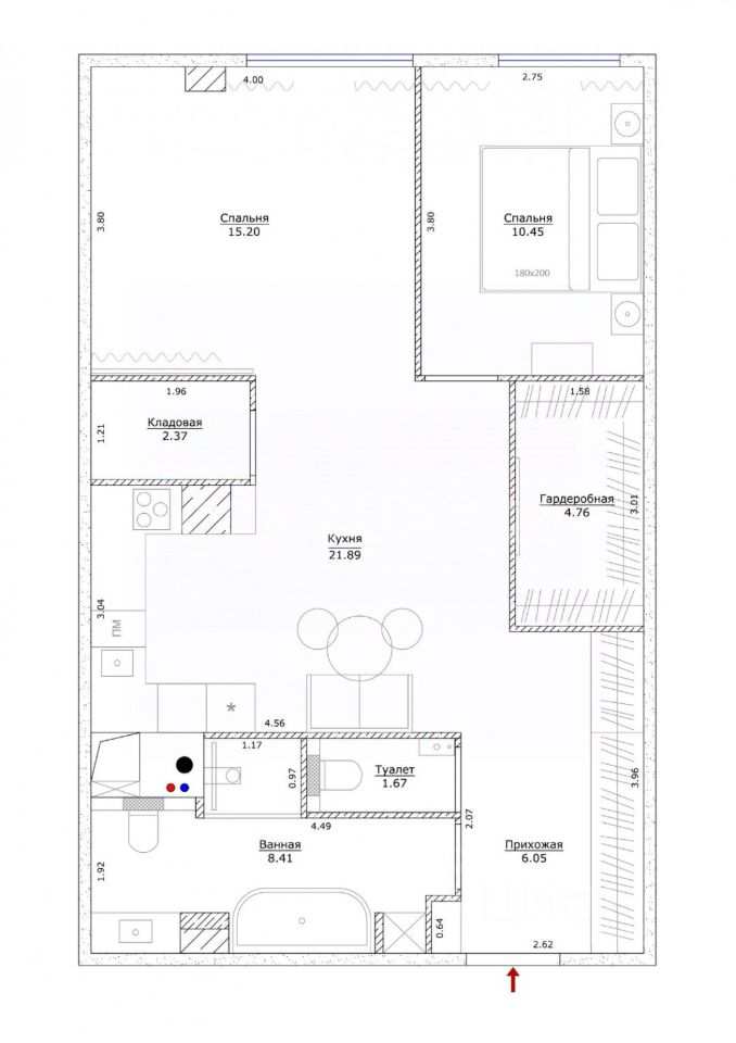 Общая площадь — 70,8 м² по ЕГРН. Наше главное преимущество - продуманная до мелочей планировка с элементами декора. Изолированная спальня 10.45 м², гостиная - 15.20 м², гардеробная - 4.76 м², постирочная и два раздельных санузла, один из которых — 8,41 м². Высота потолков - 3.1 метра. В большом санузле установлена качественная сантехника премиум-класса с просторной ванной и стильной душевой кабиной, а также несколькими сценариями света для создания идеальной атмосферы в любое время суток.