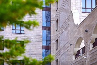 Авторская архитектура, эксклюзивная отделка фасадов, для облицовки использовался мраморированный известняк (юрский камень) бежевого цвета двух фактур - вощеный и колотый и дополнил цветовую гамму "шоколадный" гранит, облицовывающий цокольный этаж, что обеспечивает жителям тишину и максимальную приватность.