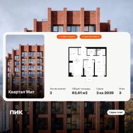 Новостройка! Продается 2-комн. кв-ра площадью 62,61 кв.м, (Корпус 3.4, Секция 4) 3 этаж 32-этажного дома в Квартал Мит от ПИК. "Квартал Мит" строится в экологически чистом районе Митино, где по соседству расположен большой лесопарк, а с двух сторон протекают реки Сходня и Журавка. Для семей с детьми здесь появится школа и два детских сада.
