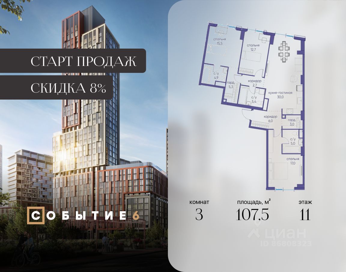 Продаётся 3-комнатная квартира от застройщика: общая площадь 107.50 м², жилая 35.20 м², кухня 30.00 м², 11-й этаж, жилой квартал "Событие-6", корпус 2 (секция 5) Срок сдачи: 1 квартал 2029 года.