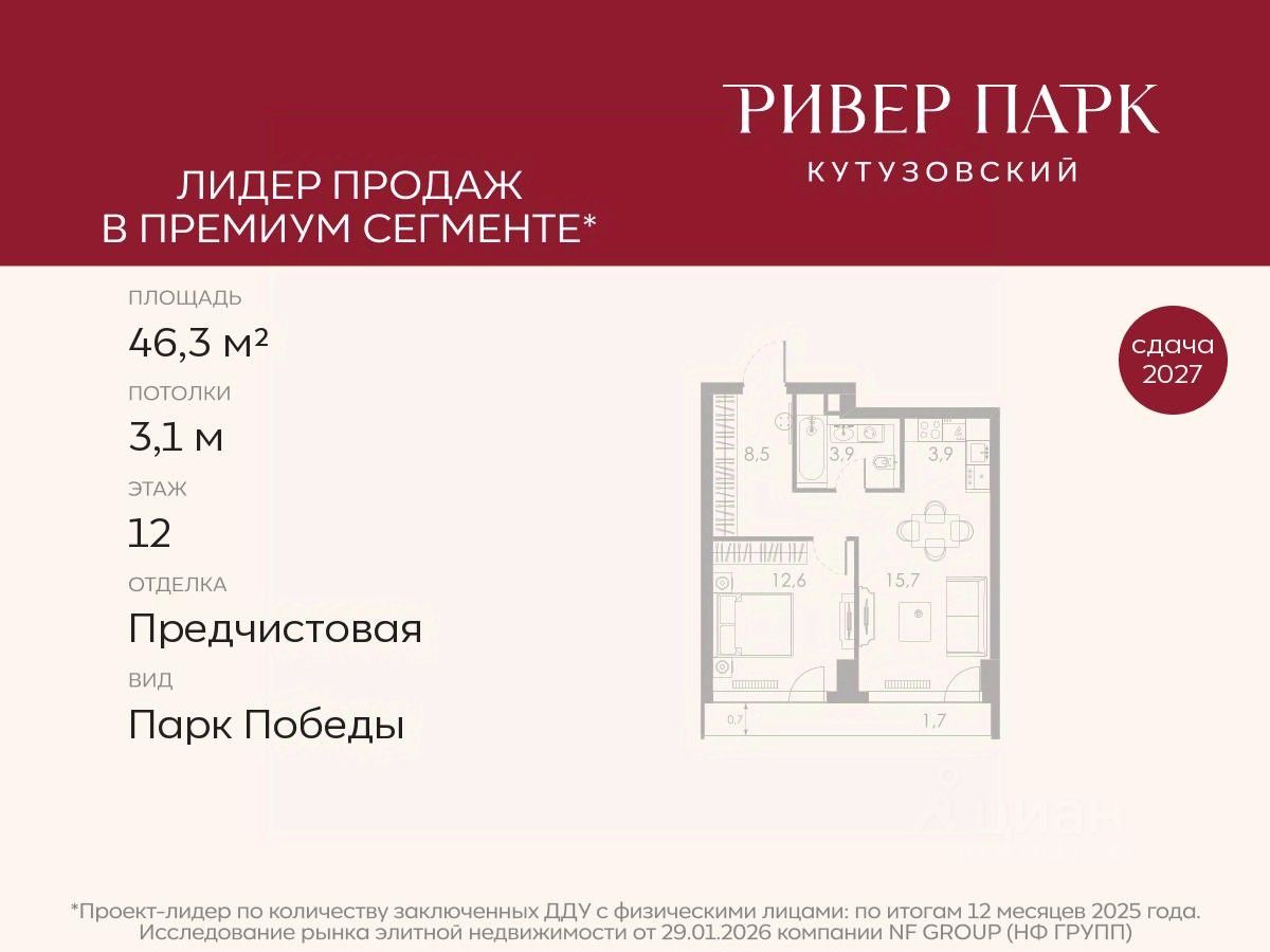Продается 1-к квартира площадью 46.3 кв.м. на 12-м этаже в жилом комплексе премиум-класса Ривер Парк Кутузовский в Башне Бриллиант