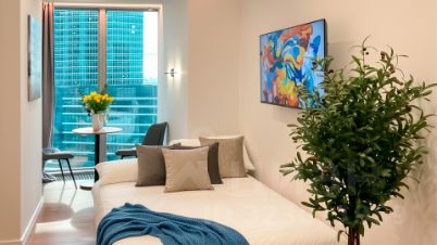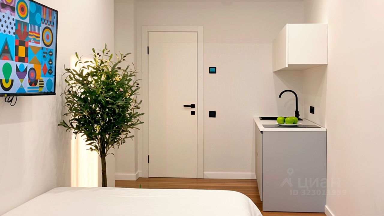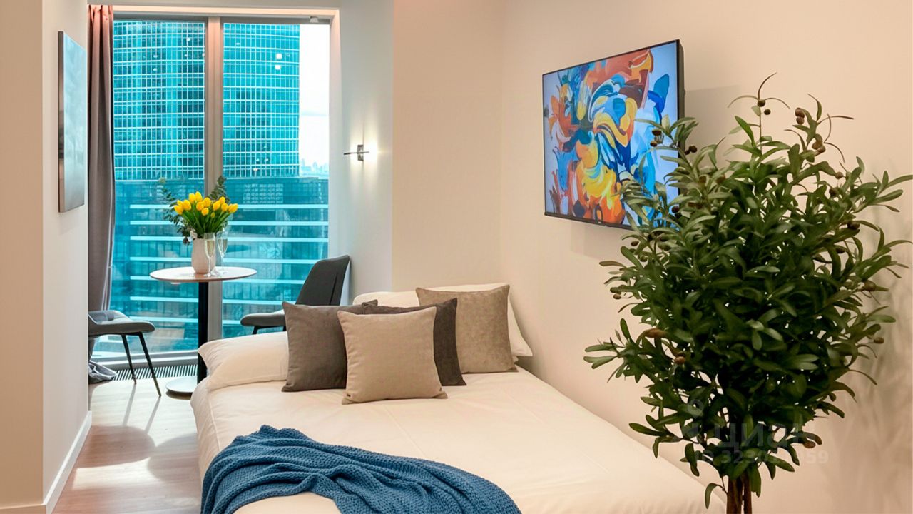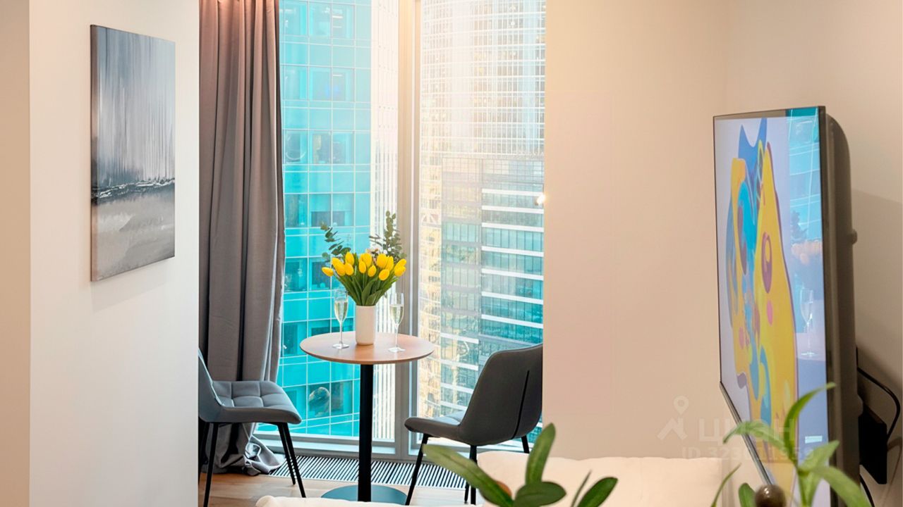 Апартаменты площадью 20 м² с дизайнерской отделкой в светлых тонах. Пространство полностью укомплектовано мебелью и бытовой техникой — готово для жизни и сдачи в аренду. Панорамные окна открывают виды на башни "Москва-Сити" и город.