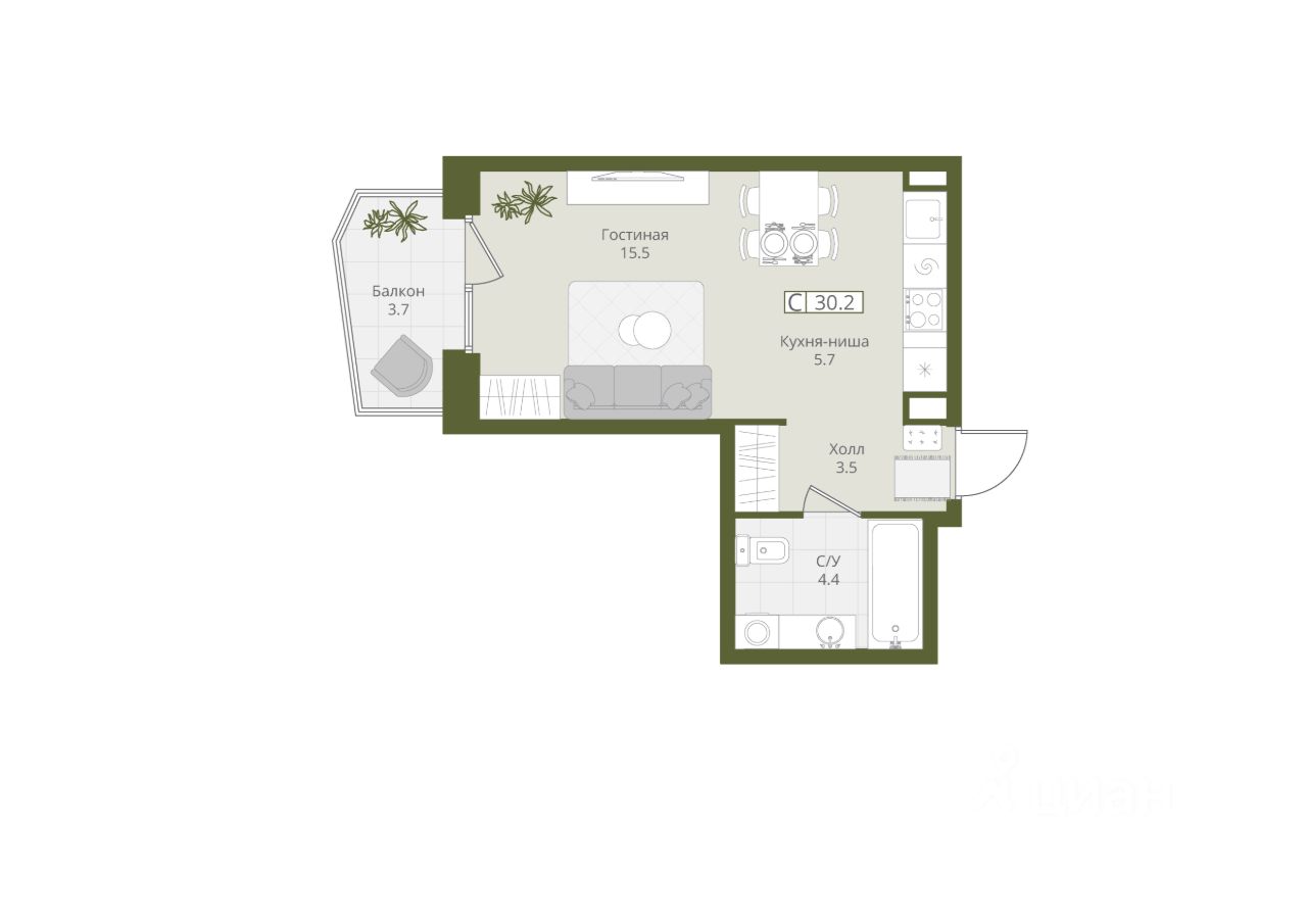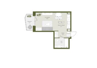 Продается 1-комнатная квартира на 2 этаже от застройщика. Общая площадь 30,2 кв.м.