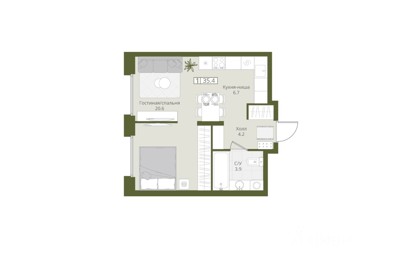 Продается 1-комнатная квартира на 3 этаже от застройщика. Общая площадь 35,4 кв.м.