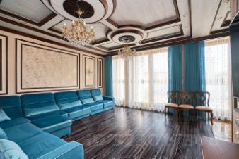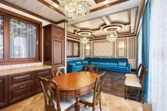 В отделке входных групп и общественных зон используются светлый камень, дерево, мягкое освещение. Монолитно-железобетонный каркас. Наружные, внутренние стены -керамический пористый кирпич, отделка натуральным камнем. Итальянские бронированные двери декорированы ценными породами дерева. П-образная форма дома образует уютное внутреннее пространство: аккуратные газоны и стриженые кустарники в окружении мощеных дорожек. Вся территория огорожена и охраняется.