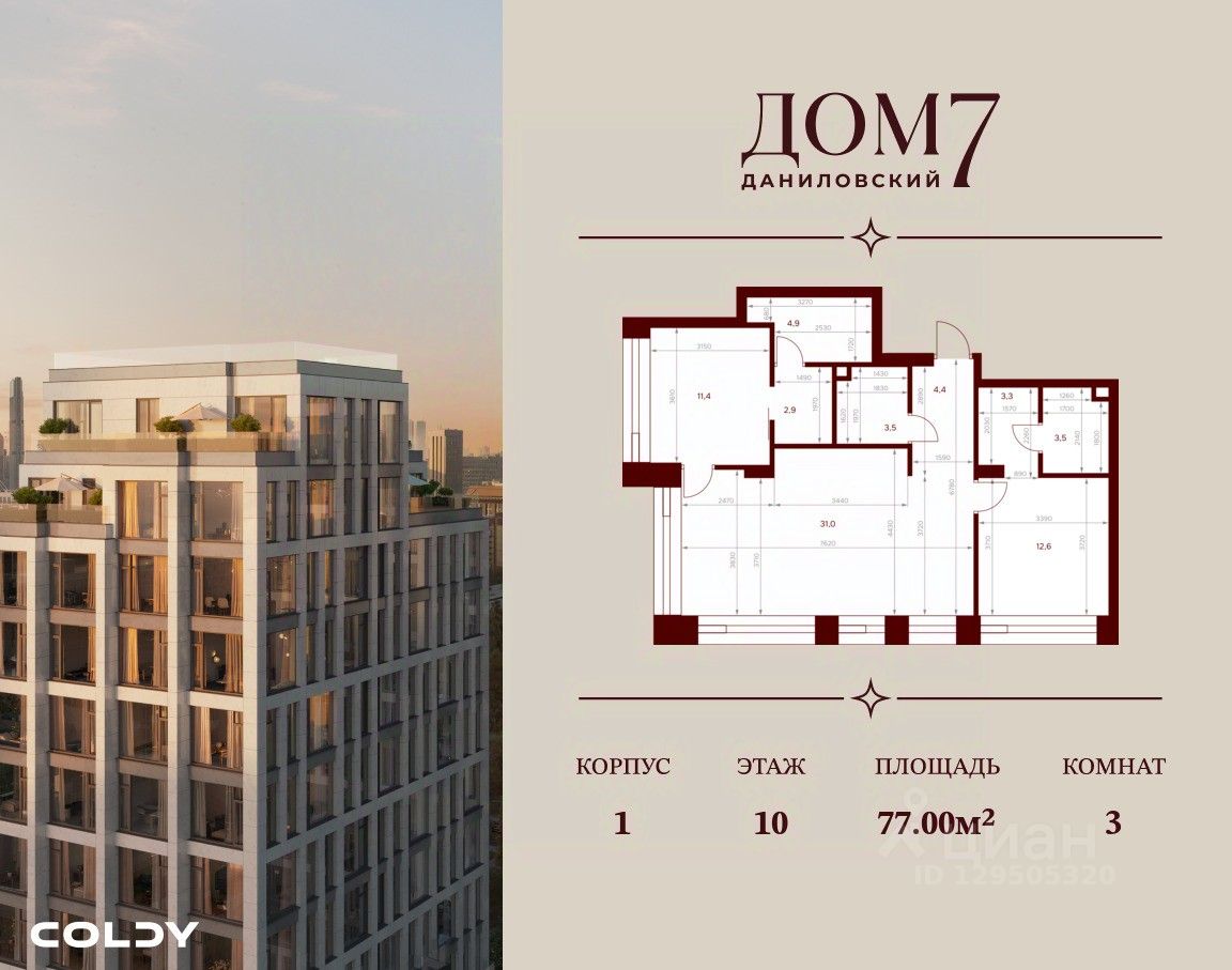 Продается 3-к квартира общей площадью 77.00 кв.м на 10 этаже в жилом квартале премиум-класса "Дом 7 Даниловский".