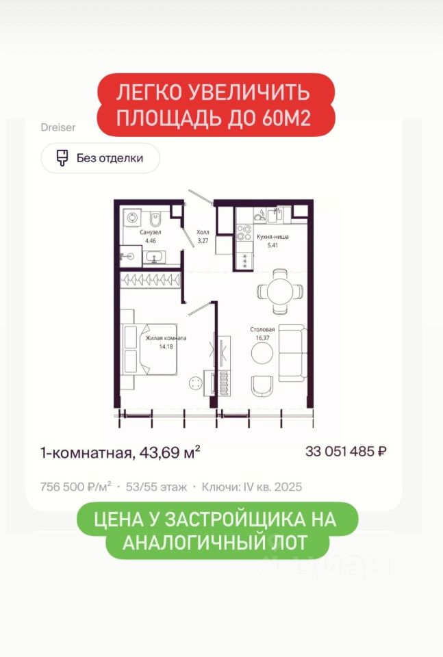 Квартира (не апартаменты) площадью 42,63 м² в новом жилом комплексе MOD, всего в 5 минутах пешком от м. Марьина Роща 2 минуты от ТТК. Дом готов . Корпус под номером удачи N7 Dreiser.