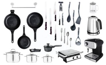 5. Кастрюля, 3 шт., Сковорода - 2 шт., Ковш, Сотейник, Нож - 6 шт, Ложка - 6 шт., Вилка - 6 шт., Ножеточка, Половник, Лопатка, Штопор,