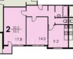 Общая площадь квартиры составляет 54 кв. м, Жилая площадь — 32 кв. м, кухня — 9.2 кв. м. Высота потолков — 2.64 метра.