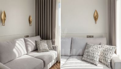 Апартаменты меблированы и укомплектованы бытовой техникой. Функциональная планировка включает кухню-гостиную с обеденной зоной, мастер-спальню с собственной ванной комнатой и гардеробной, вторую спальню, гостевой санузел, постирочную и прихожую с гардеробной. Из окон открываются виды на благоустроенную территорию комплекса.