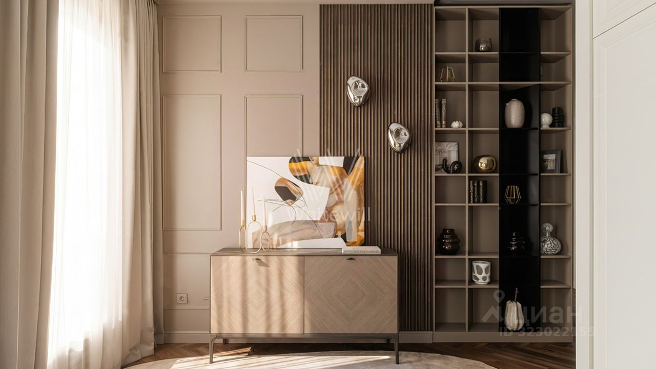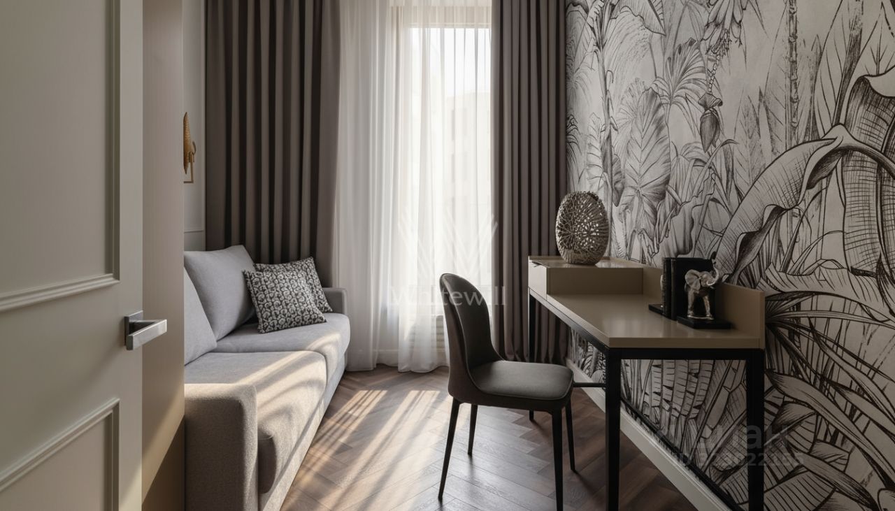 Апартаменты с двумя спальнями общей площадью 62 м² в комплексе особняков Titul на Серебрянической. Апартаменты расположены на пятом этаже в корпусе Aureus. Выполнена отделка по индивидуальному дизайн-проекту, интерьеры украшают декоративные молдинги. Высота потолков 3,15 метра. Установлена индивидуальная система кондиционирования.