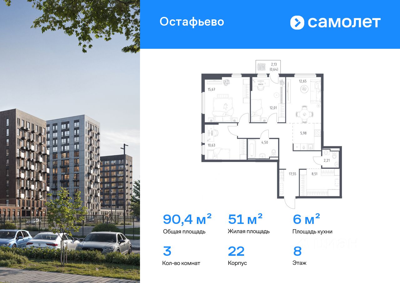 Строим кварталы для жизни с заботой о будущем. Предлагается 3-комнатная квартира комфорт-класса 90,35 кв.м в корпусе 22 на 8 этаже, в ЖК "Остафьево"