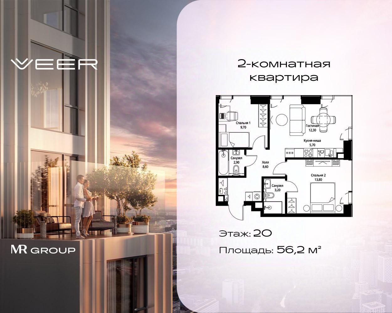 Продаётся 2-комнатная квартира общей площадью 56.20 м² с предчистовой отделкой в ЖК VEER на 20-м этаже 46 этажного дома.