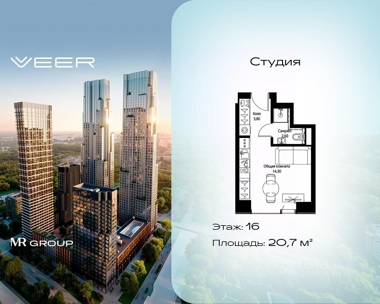 Продаётся студия общей площадью 20.70 м² с предчистовой отделкой в ЖК VEER на 16-м этаже 46 этажного дома.