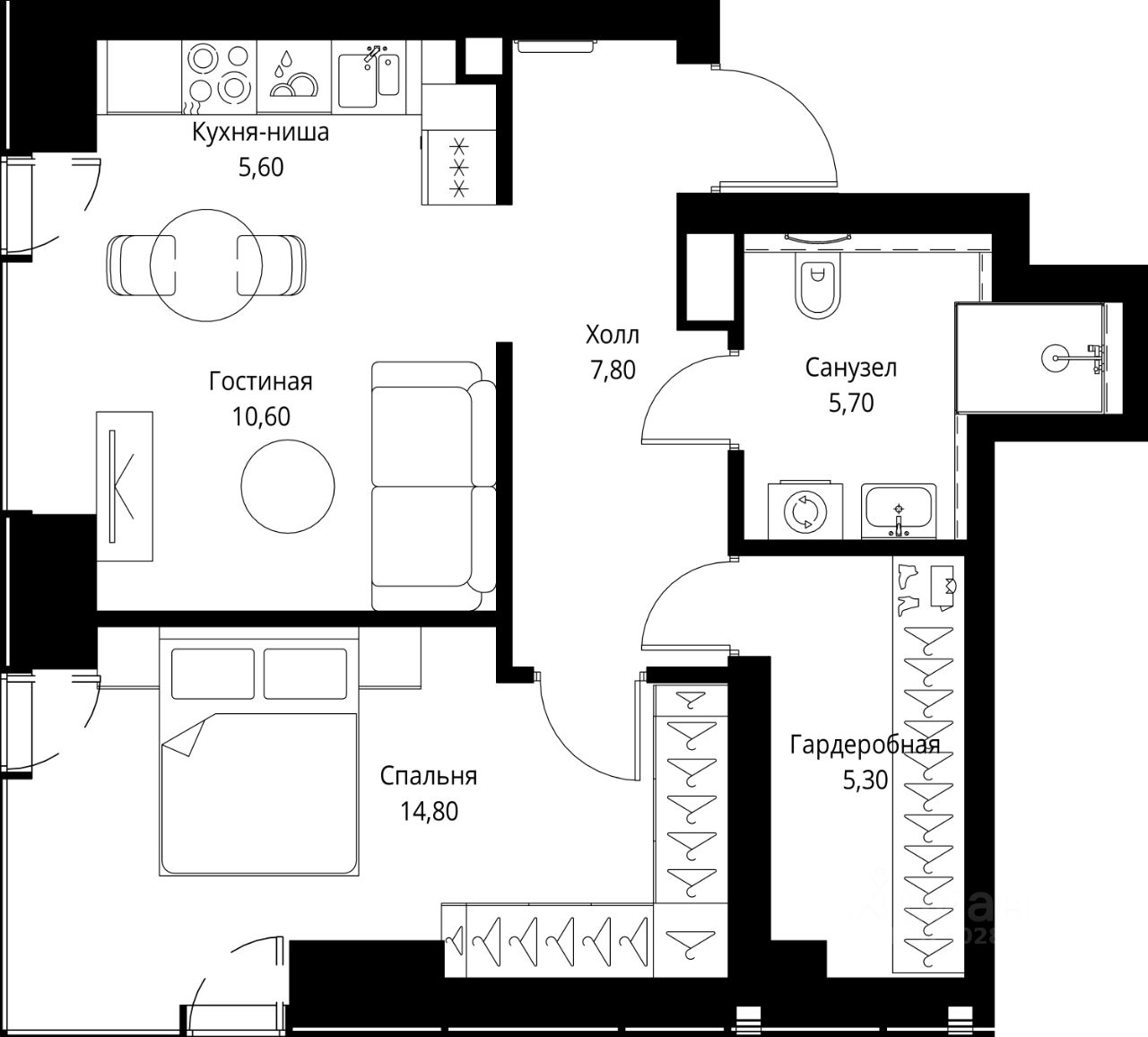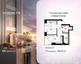 Продаётся 1-комнатная квартира общей площадью 49.80 м² с предчистовой отделкой в ЖК VEER на 6-м этаже 46 этажного дома.