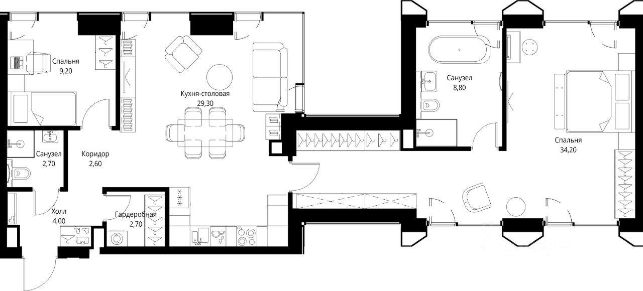 Продаётся 2-комнатная квартира общей площадью 93.50 м² с предчистовой отделкой в ЖК VEER на 2-м этаже 46 этажного дома.