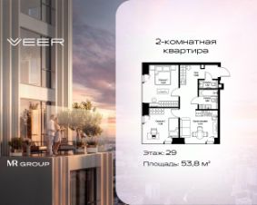 Продаётся 2-комнатная квартира общей площадью 53.80 м² с предчистовой отделкой в ЖК VEER на 29-м этаже 46 этажного дома.
