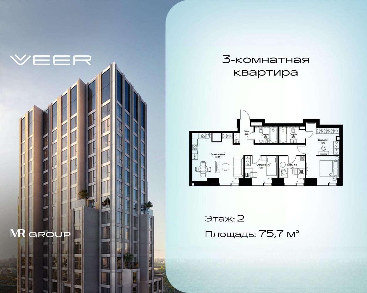 Продаётся 3-комнатная квартира общей площадью 75.70 м² с предчистовой отделкой в ЖК VEER на 2-м этаже 46 этажного дома.
