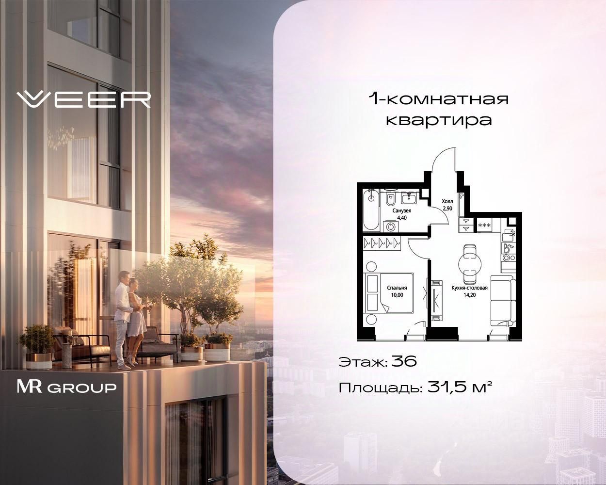 Продаётся 1-комнатная квартира общей площадью 31.50 м² с предчистовой отделкой в ЖК VEER на 36-м этаже 46 этажного дома.