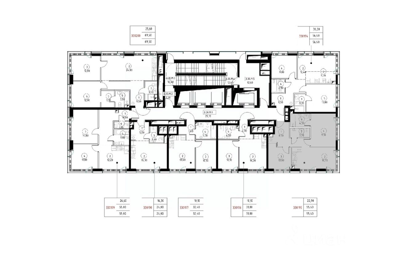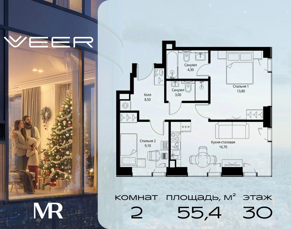 Продаётся 2-комнатная квартира общей площадью 55.40 м² с предчистовой отделкой в ЖК VEER на 30-м этаже 46 этажного дома.