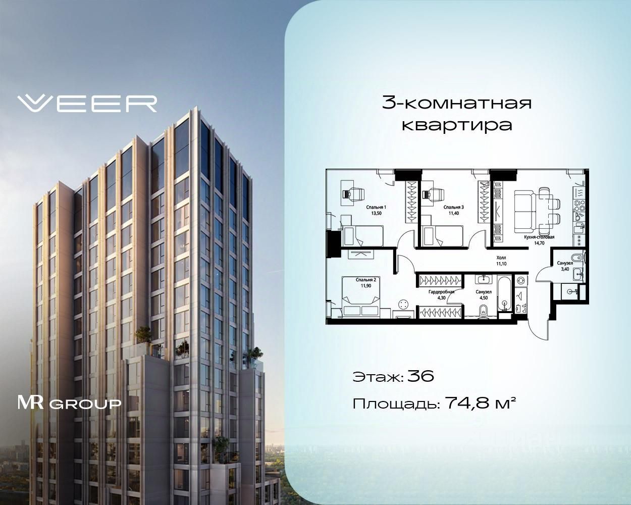 Продаётся 3-комнатная квартира общей площадью 74.80 м² с предчистовой отделкой в ЖК VEER на 36-м этаже 46 этажного дома.
