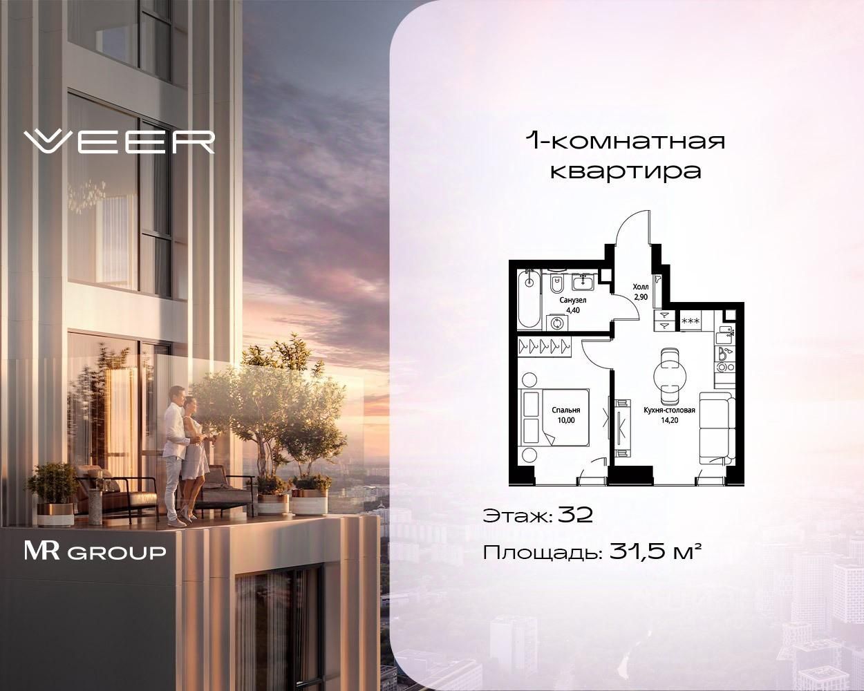 Продаётся 1-комнатная квартира общей площадью 31.50 м² с предчистовой отделкой в ЖК VEER на 32-м этаже 46 этажного дома.