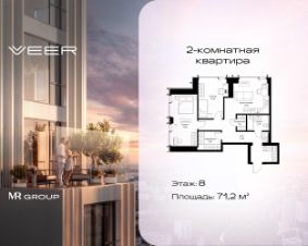 Продаётся 2-комнатная квартира общей площадью 71.20 м² с предчистовой отделкой в ЖК VEER на 8-м этаже 59 этажного дома.
