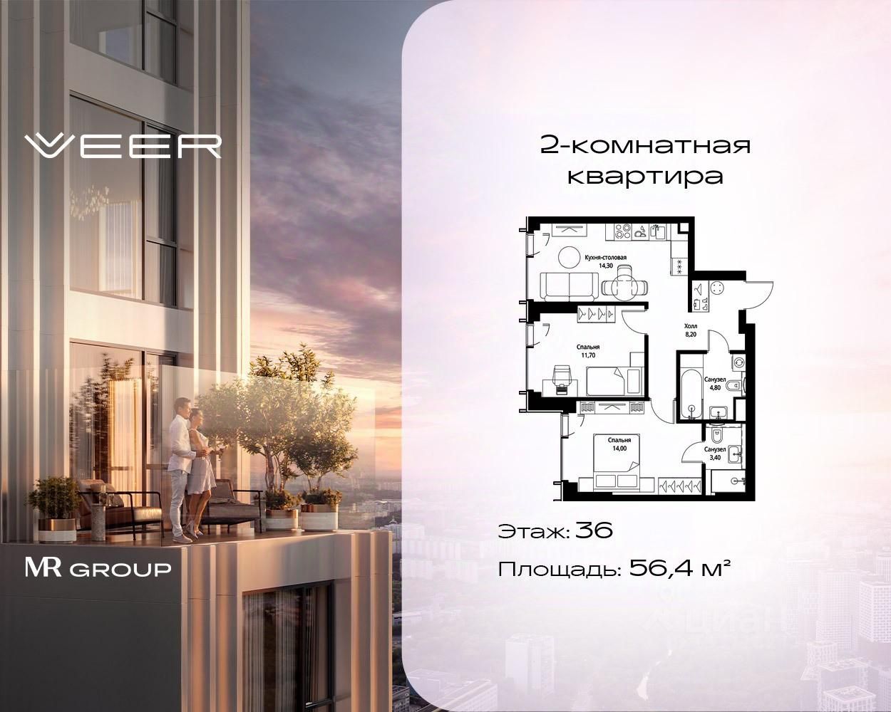 Продаётся 2-комнатная квартира общей площадью 56.40 м² с предчистовой отделкой в ЖК VEER на 36-м этаже 59 этажного дома.