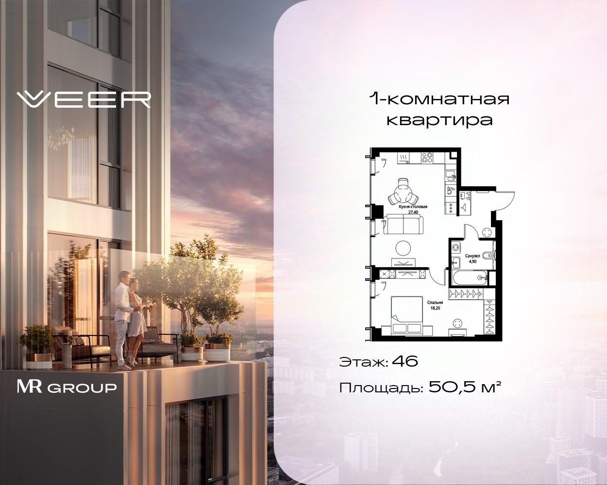 Продаётся 1-комнатная квартира общей площадью 50.50 м² с предчистовой отделкой в ЖК VEER на 46-м этаже 59 этажного дома.