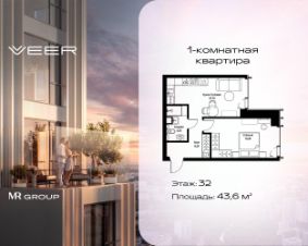 Продаётся 1-комнатная квартира общей площадью 43.60 м² с предчистовой отделкой в ЖК VEER на 32-м этаже 59 этажного дома.