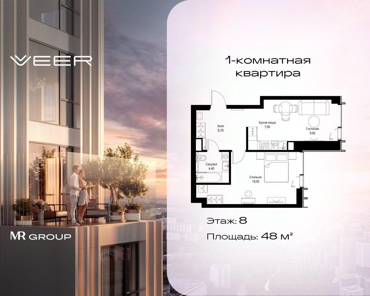 Продаётся 1-комнатная квартира общей площадью 48 м² с предчистовой отделкой в ЖК VEER на 8-м этаже 59 этажного дома.