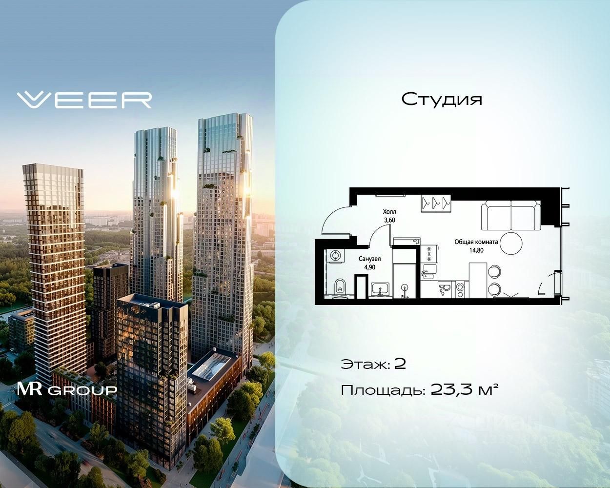 Продаётся студия общей площадью 23.30 м² с предчистовой отделкой в ЖК VEER на 2-м этаже 59 этажного дома.