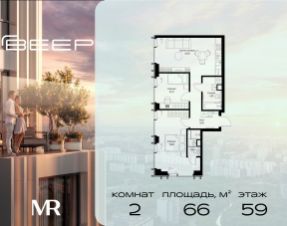 Продаётся 2-комнатная квартира общей площадью 66 м² с предчистовой отделкой в ЖК Веер на 59-м этаже 59 этажного дома.