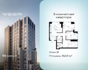 Продаётся 3-комнатная квартира общей площадью 82.60 м² с предчистовой отделкой в ЖК VEER на 8-м этаже 59 этажного дома.