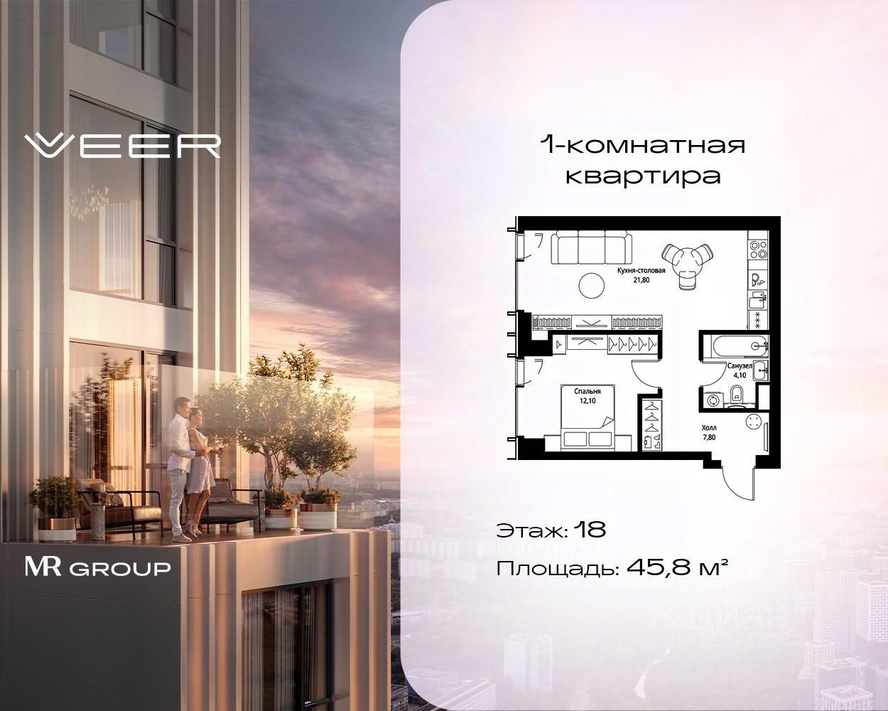 Продаётся 1-комнатная квартира общей площадью 45.80 м² с предчистовой отделкой в ЖК VEER на 18-м этаже 59 этажного дома.