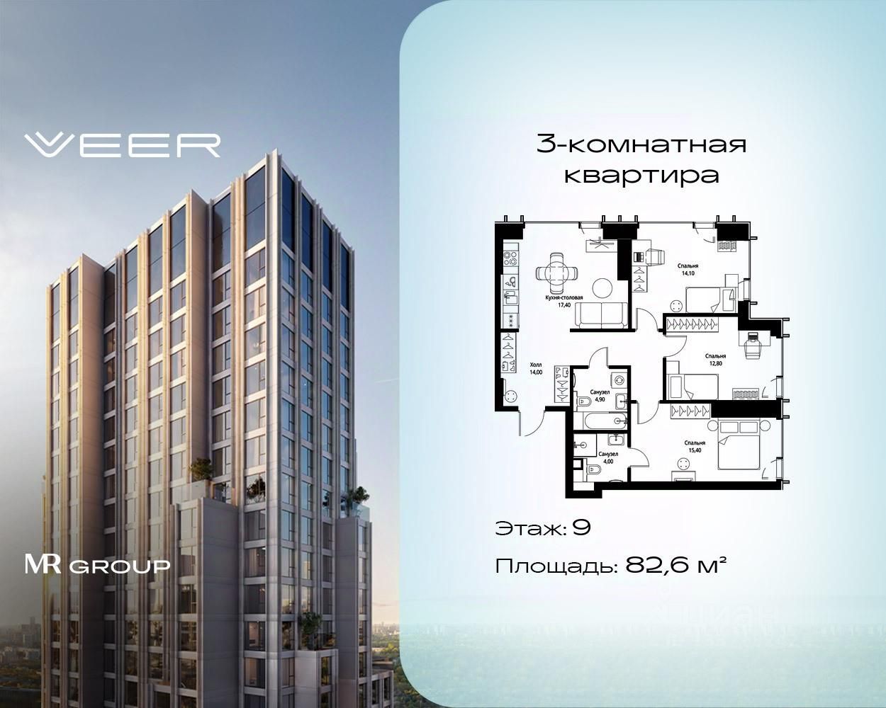 Продаётся 3-комнатная квартира общей площадью 82.60 м² с предчистовой отделкой в ЖК VEER на 9-м этаже 59 этажного дома.